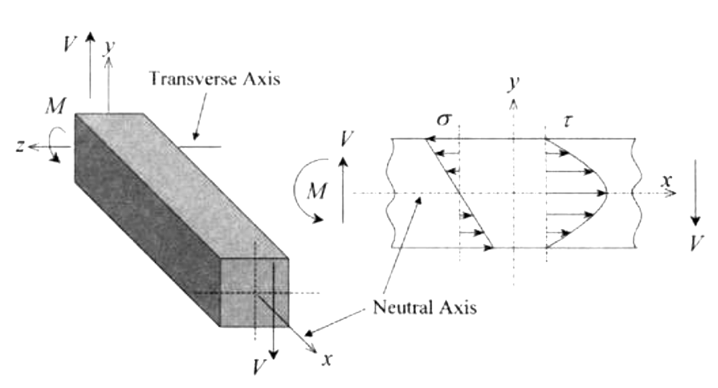 방향에 따라 특성이 변화하지 않으며, 균질한 등방성 재료라고 가정하자. 또한, 이 물질은 훅의 법칙을 따른다고 가정한다. 이제 순수 휨 모멘트($M$)를 받는 일정한 단면적을 가진 직선 보를 생각해 보자. 보의 단면이 여전히 평면을 유지하고 단면 주축의 하나가 휘어지는 면과 일치하면 발생한 수직 응력은 다음 식과 같다.