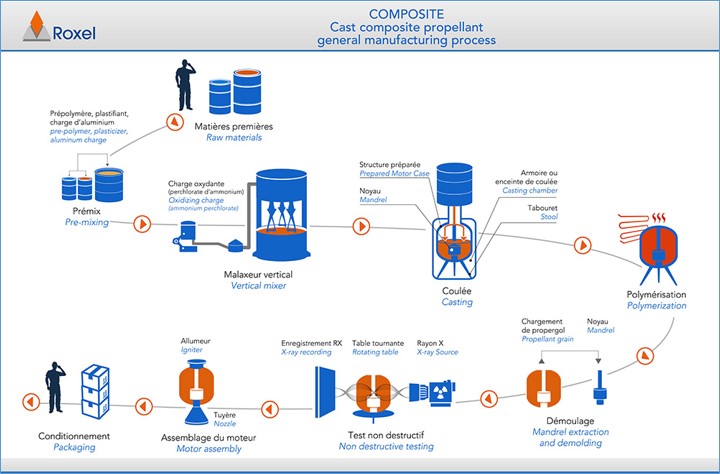 추진제 원료를 혼합하고 반죽하여 유동 상태가 된 것을 미리 단열재와 라이너를 붙여 놓은 연소관 안에 흘려서 속에 집어 넣는 주입 작업을 수행한다. 일정 시간이 지나 추진제가 경화한 후 고체로켓이 완성된다. 이 과정에서 추진제에 균열이나 틈이 있으면 연소할 때 그 틈에 화염이 들어가 연소 면적이 급격히 확대되고, 이상 연소가 일어날 수 있다. 그러면 연소압력이 급상승하고, 연소관의 손상을 초래할 수 있다. 따라서 주입 작업은 진공에서 이루어진다.