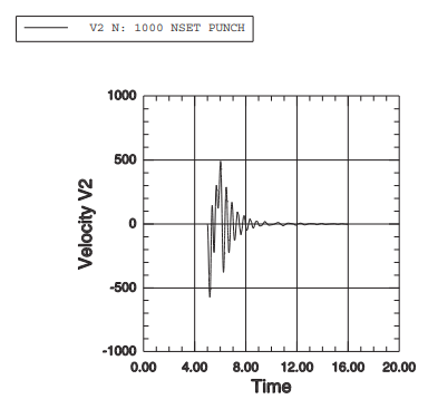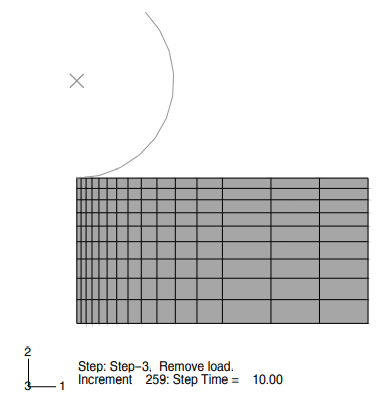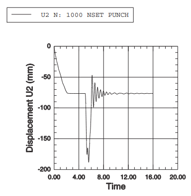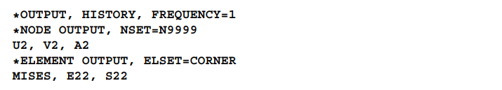 Abaqus/Standard는 펀치의 강체 기준 절점(절점 세트 N9999에 포함됨)에서 수직 방향 변위, 속도, 가속도 변수를 작성한다. 모든 증분 후에 출력 데이터베이스의 이력 부분에 추가한다. 또한 블록의 모서리에 있는 요소의 Mises 응력, 2면 2방향의 로그 변형률, 2면 2방향의 응력 변수가 출력 데이터베이스의 이력 출력 영역에 증분마다 기록된다. 이런 응력과 변형률 변수는 요소의 모든 적분점에 대해 출력된다.