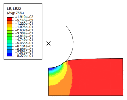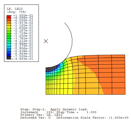 이 예제에서 탄성 Foam 재료 시편을 구형 펀치로 누를 때 LE22의 출력을 표시한다. 재료 블록에 충돌할 때의 거동을 조사한다. 변형 결과는 다음 그림과 같다.