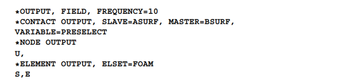 탄성 Foam 예제의 첫 번째 단계에는 해석의 각 단계의 데이터 출력을 제어하는 옵션 세트가 포함된다. 이 출력은 출력 종류에 따라 출력 데이터베이스의 필드 출력 영역 또는 이력 출력 영역에 기록된다.