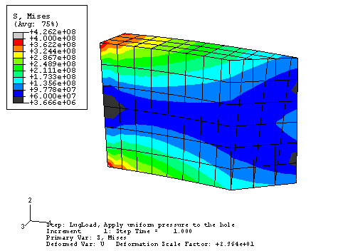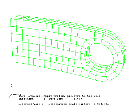 이 러그는 한쪽 끝이 크고 무거운 구조물에 단단히 용접되고, 반대쪽 끝에는 구멍이 하나 있다. 사용할 때는 러그의 구멍에 볼트가 들어간다. 이 볼트에 30kN의 하중을 음의 2방향으로 작용했을 때 러그의 정적 변형을 계산한다. 이 해석의 목적은 러그의 정적 변형을 계산하므로, 해석에 Abaqus/Standard를 사용한다.