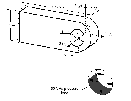 이 예제는 3차원 연속체 요소를 사용하여 그림의 연결용 러그를 해석한다.