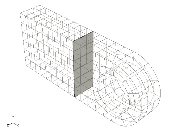 이 모델은 연결용 러그의 왼쪽 끝을 세 방향으로 모두 구속해야 한다. 이 영역은 러그가 부모 구조물과 결합하는 곳이다(그림 참조). Abaqus/CAE에서 경계 조건은 유한 요소 요소망 자체가 아니라 파트의 기하 영역에 적용된다. 이처럼 경계 조건과 파트 기하 형상이 관련되므로, 요소망이 변해도, 경계 조건을 재지정할 필요가 없고, 요소망의 변경을 간단하게 할 수 있다. 하중의 정의도 마찬가지다.