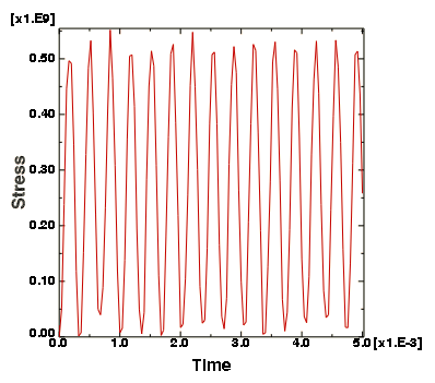 연결용 러그의 응력의 시간 이력도 조사한다. 러그의 고정단 부근의 영역은 피크 응력의 발생이 예측되고 재료가 항복할 수 있으므로 특히 주목한다. Mises 응력 vs. 시간을 표시하려면 다음과 같이 설정한다.