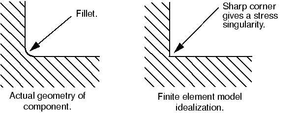 유한 요소 모델에서 필렛 반경과 같은 미세 부분을 생략하고 해석을 단순화하고 모델을 적당한 크기로 줄이는 경우가 많다. 그러나 모델에 날카로운 모서리가 있으면 필드에 응력 특이성이 생긴다. 일반적으로 이것은 모델의 전반적인 응답에 거의 영향을 미치지 않지만, 특이점에 가까운 예측 응력은 부정확하다.