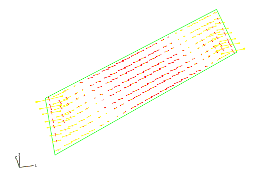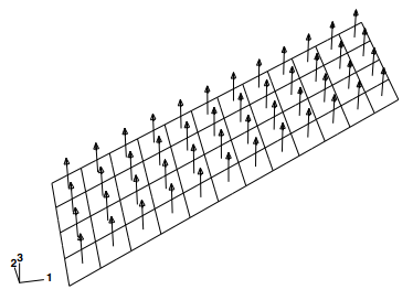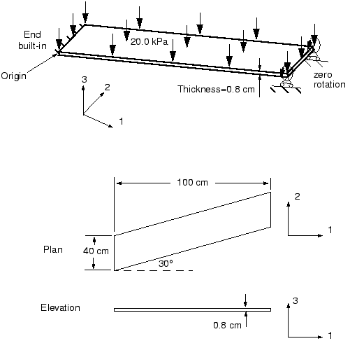 그림에 표시된 플레이트를 만든다. 이 플레이트는 글로벌 1축에 30° 기울어지고, 한쪽 끝은 완벽히 고정되고, 반대쪽 끝은 플레이트의 축에 평행한 레일 위를 이동하도록 제한된다. 이 플레이트가 균일한 압력을 받았을 때 스팬 중앙의 처짐을 찾는다. 또한 이 문제에서 선형 해석이 유효한지 Abaqus/Standard를 사용하여 해석하고 평가한다.
