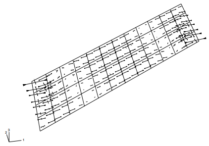 글로벌 좌표계에서 이 구조의 방향은 모델 그림과 같다. 글로벌 직교 좌표계는 기본 재료 방향을 정의한다. 그러나 이 판은 이 좌표계에서 기울어져 있다. 재료 1방향의 직접 응력($\sigma_{11}$)은 플레이트의 휨으로 생긴 축 응력과 플레이트 축을 가로지르는 응력 모두의 영향을 받기 때문에 기본 재료 방향을 사용하면 해석 결과를 분석하기가 쉽지 않다. 재료 방향이 플레이트의 축과 가로 방향으로 정렬하면, 결과의 해석은 간단해진다.