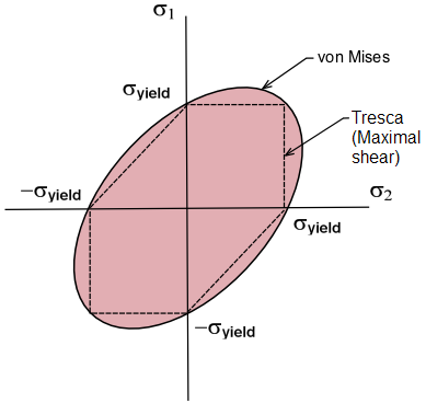 위 그림은 평면 응력 상태에서 연성 파괴 이론을 표현한 것이다. 타원과 다이아몬드 다각형으로 둘러싸인 영역은 각각 변형 에너지 이론과 최대 전단 응력 이론에 의해 안전하다고 판단되는 응력 상태를 나타낸다.