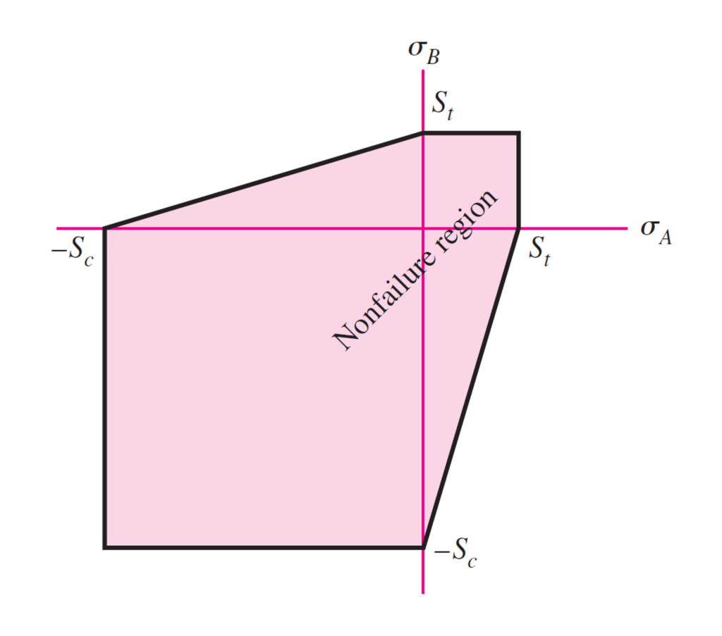 그림은 외부 직사각형과 외부의 다각형, 내부의 다각형으로 둘러싸인 응력 상태 영역들을 각각 보여준다. 이 영역들은 평면 응력 조건에서 각각 최대 수직 응력과 모어-콜롬 이론, 모어 수정 이론에 의해 예측되는 안전한 응력 상태를 나타낸다.