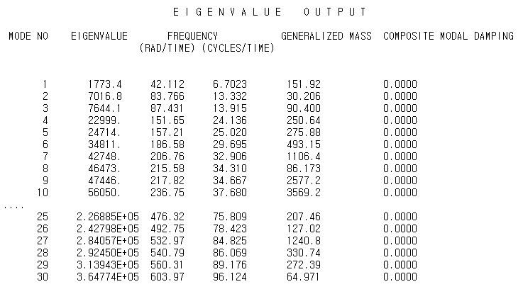 이 해석은 Lanczos 고유치 해법을 사용하고 30개의 고유치를 요청한다. 필요한 모드 수를 지정하는 대신, 주목하는 최소 진동수와 최대 진동수를 지정하는 것으로, 그 범위 안에서 모든 고유치가 발견되면 단계를 종료할 수 있다. 시프트 포인트를 지정하여 시프트 포인트에 가장 가까운 고유치를 추출할 수도 있다. 기본적으로 최소와 최대 진동수 또는 시프트는 사용하지 않는다. 구조가 강체 모드로 구속되지 않으면 시프트 값을 작은 음수로 설정하여 강체 운동과 관련된 수치 문제를 제거한다.