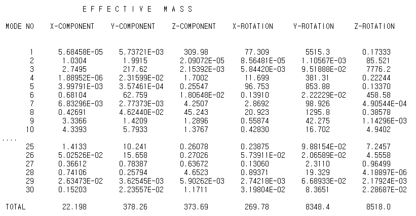 유효 질량 테이블은 단일 모드의 각 자유도에서 유효 질량의 크기를 나타낸다. 이 결과는 두 번째 방향의 질량이 큰 첫 번째 모드가 모드 3임을 보여준다. 두 번째 방향의 모든 모드 유효 질량은 378.26kg이다. 모델의 총질량은 데이터 파일 앞에 주어지며 414.34kg이다.