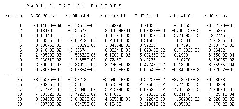Participation Factors 테이블은 각 모드가 작용하는 지배적인 자유도를 보여준다. 예를 들어, 이 결과에서 모드 1은 세 번째 방향으로 주로 작용한다는 것을 알 수 있다.
