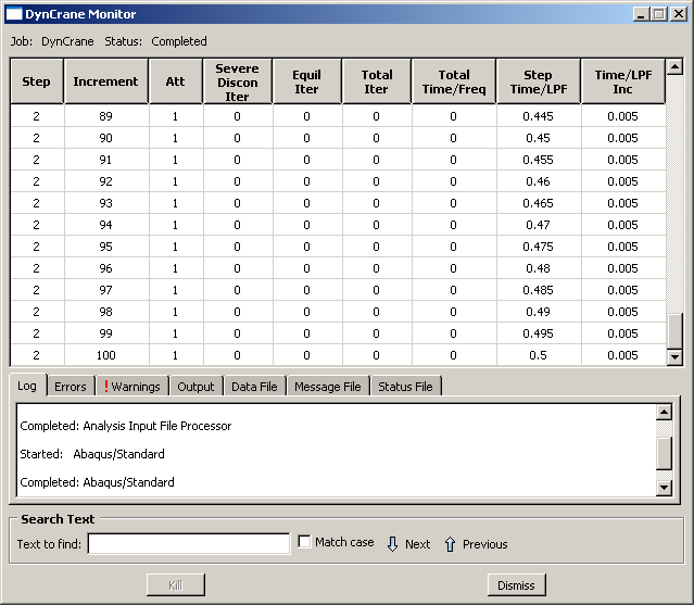 Job Monitor는 해석에 사용된 자동 시간 증분 기능의 요약을 증분 단위로 제공한다. 이 정보는 증가가 완료되면 바로 기록되므로 실행 중인 해석을 관찰할 수 있다. 이 기능은 크고 복잡한 문제에서 유용하다. Job Monitor에서 얻은 정보는 상태 파일(DynCrane.sta)에서 얻은 정보와 같다.