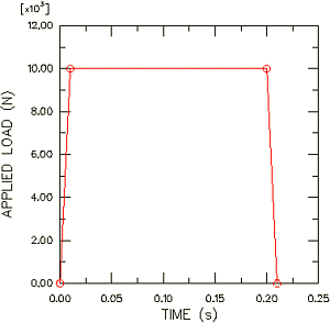이 예제는 ‘예제: 화물 크레인’에서 해석한 것과 같은 화물 크레인을 사용한다. 이번은 0.2초 동안 10kN의 매달린 하중을 후크에 주었을 때의 응답을 조사한다. 점 A, B, C, D의 연결은 100kN의 최대 인력까지만 견딜 수 있다. 이런 조인트가 손상되었는지를 결정해야 한다. 주어진 하중의 크기 vs. 시간은 그림에 나와 있다.