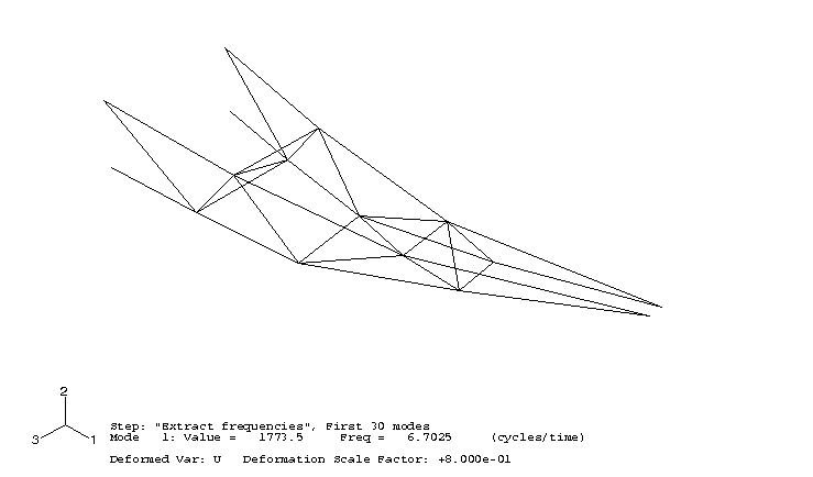 Visualization 모듈을 시작하고 ODB 파일 DynCrane.odb를 연다. 얻어진 고유 진동수에 대응하는 변형 모드는 그 진동수에 대응하는 모드 형상을 표시하여 시각화할 수 있다.