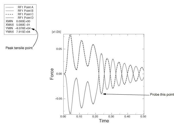 결합점에서 피크 인출력을 구하려면 결합 절점에서 1방향 반력(변수 RF1)의 X-Y 표시한다. 이를 위해서는 동시에 복수의 커브를 표시하는 것이 필요하다.
