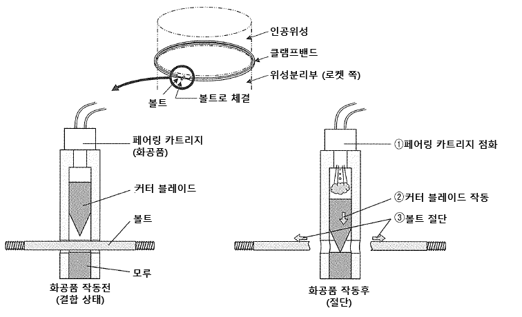 두 방식은 모두 화공품 작동 후에 폭발가스를 외부에 노출하지 않는 밀봉형으로 위성의 표면을 오염시킬 우려는 없다. 위성은 로켓 기체 최상부의 위성 분리부에 탑재한다. 그러므로 위성의 분리 방식은 위성 분리부의 사양으로 결정된다.