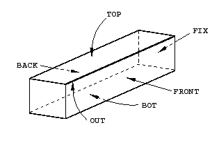 다음 그림과 같이 형상 세트 TOP, BOT, FRONT, BACK, FIX, OUT을 만든다(세트 OUT에는 그림에 굵은 선으로 표시된 모서리가 포함된다). 그림과 같이 서피스 LOAD를 만든다. 나중에 이 영역은 하중과 경계 조건 적용과 출력 요청 정의에 사용된다.