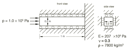 문제를 1차원 변형 문제로 만들기 위해 네 가지 측면 모두 롤러가 있다. 따라서 이 3차원 모델은 1차원 문제를 해석한다. 재료는 위 그림에 표시된 특성을 가진 강철이다. 막대의 자유 단은 1.0×105Pa의 크기와 3.88×10-5초의 지속 시간을 갖는 폭발 하중을 받는다. 정규화된 하중 크기는 다음 그림과 같다.