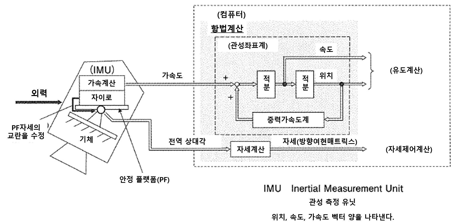 ① 가속도계 3개와 자이로 3개를 기체 직교 3축 방향에 고정한다.