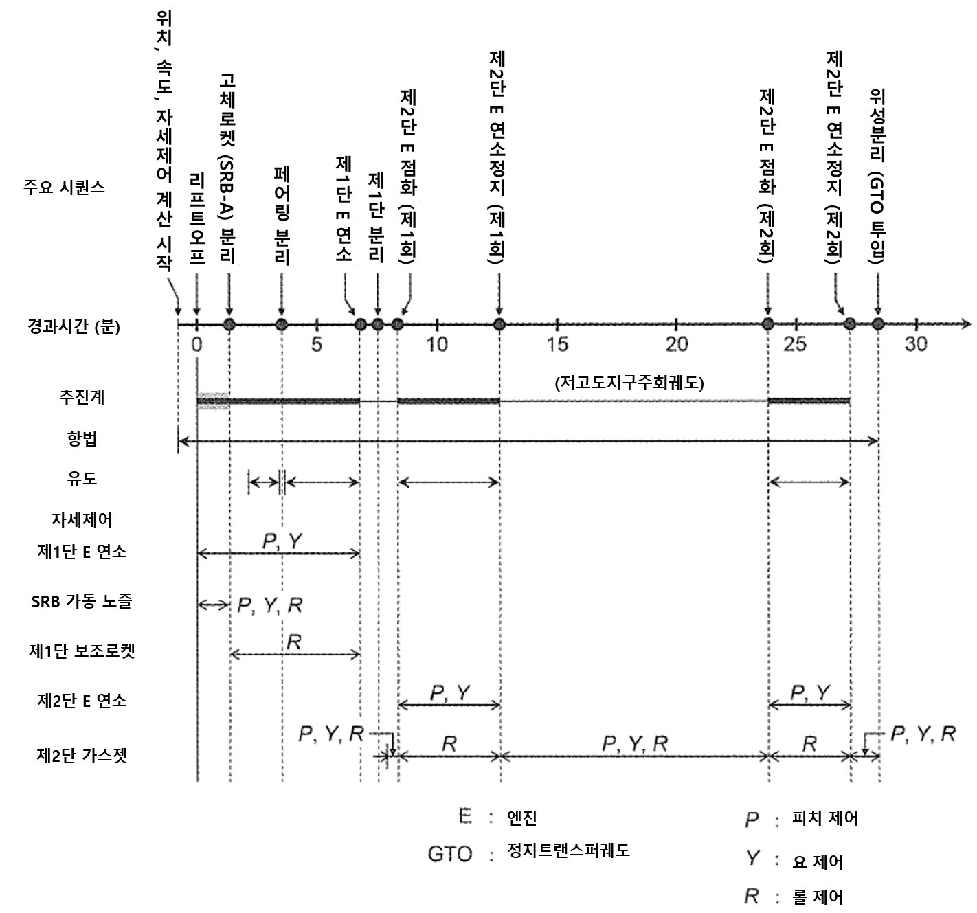 일반적인 우주로켓이 정지위성을 발사할 때 모든 비행 과정을 생각하고, 표준 이벤트 절차에 항법, 유도, 자세 제어 실행 상황을 다음 그림에 나타냈다. 자세 제어는 각각의 제어 기기가 맡는 범위를 나타낸다.