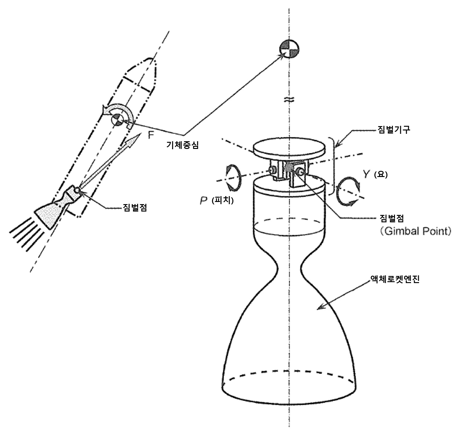 엔진의 연소실이나 노즐을 기계적으로 회전시키는 것으로 액체로켓 엔진의 수평 유지 기구(피치, 요, 롤) 및 고체로켓의 가동 노즐(피치, 요, 롤)이 대표적이다.