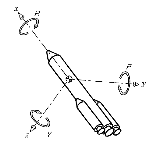 로켓은 비행 중 기체 자세를 자주 변경해야 한다. 로켓의 자세 제어는 유도 명령에 따라 지시된 대로 로켓의 자세를 변경하는 기능이며, 그것은 기체 중심을 원점으로 3축 방향으로 기체를 회전시키는 것을 의미한다. 변경해야 할 자세 각도(회전각도) 는 ‘목표 자세(유도 명령)’와 항법 계산에 따른 ‘현재 자세’의 차이이다. 로켓이 자세를 변경하려면 제어 계산 결과를 조타 신호로 내보낸다. 각 자세 제어 장치(엔진 짐벌이나 가스 제트 등)를 작동시키고 기체를 만 회전시킨다. 기체 3축 방향의 회전각을 다음 그림에 나타냈다. 그림에서 P는 Pitch, 기수가 위로 가면 양의 값을 가진다. Y는Yaw, 왼쪽이 양의 값을 가진다. R은 Roll, 기체 축 방향에서 볼 때 시계방향이 양의 값을 가진다.