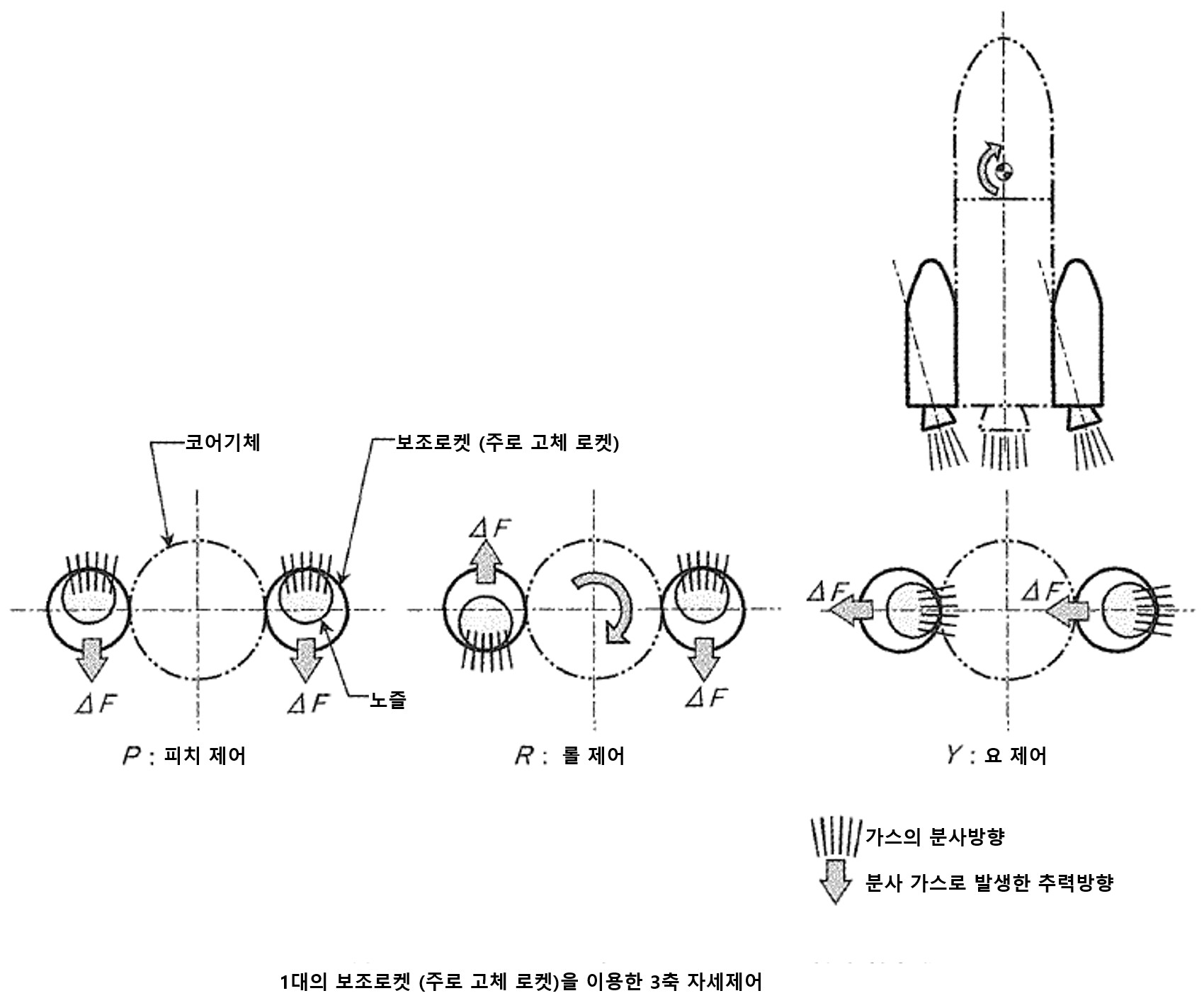 대형 우주로켓의 자세를 제어하려면 충분한 제어력이 있어야 하는데 그 제어력을 만드는 수단은 다음의 2가지 방법이 있다.