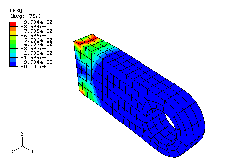 이 표시는 러그가 붙어있는 구조에 연결된 부분에서 러그가 상당히 항복한다는 것을 보여준다. 등고선 범례에 표시된 최대 소성 변형률은 약 10%이다. 그러나 이 값은 외삽 처리 때문에 오류가 포함될 수 있다. Query 도구 ⓘ를 사용하여 최대 소성 변형이 있는 요소의 적분점에서 PEEQ 값을 확인한다. 이 모델의 적분점에서 최대 등가 소성 변형률은 약 0.087이라는 것을 알 수 있다. 피크 소성 변형 근처에 변형 기울기가 있으므로 이것은 큰 외삽 오차를 의미하지는 않는다.