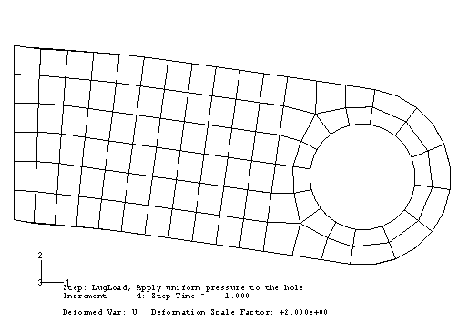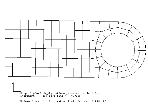 Visualization 모듈을 시작하고 PlasticLugHard.odb 파일을 연다. 새로운 결과에서 변형 형상을 표시하고, 변형 배율을 2로 변경하여 그림과 비슷하게 표시한다. 표시된 변형은 실제 변형의 2배이다.