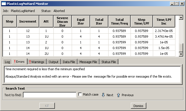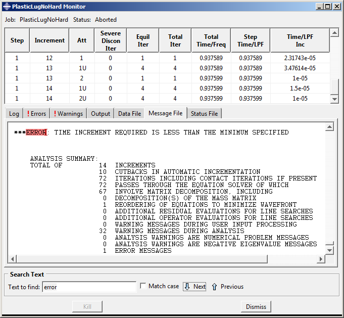 Abaqus/Standard는 지정된 하중의 94% 만 모델에 적용할 수 있었다. 이 Job Monitor에서 Abaqus/Standard가 해석 중에 여러 번 시간 증분의 크기를 줄이고(마지막(오른쪽) 열 참조), 14번째 증가에서 해석을 중단했다. 그림 10.9의 Errors 탭의 정보는 해석이 중단되었다는 것을 나타낸다. 다음 그림과 같이 Message File 탭을 클릭한다. 메시지 파일의 오류 세부 정보를 표시한다. 이 오류는 시간 증분의 크기가 이 해석에서 사용할 수 있는 값보다 작아서 해석이 중단되었다는 것을 나타낸다. 이것은 수렴 문제의 전형적인 증상이며, 시간 증분의 크기가 지속해서 감소했다는 직접적인 결과이다.