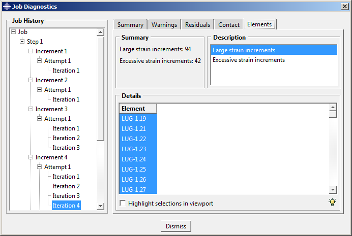 Job Diagnostics 대화 상자를 사용하면 흥미로운 결과를 얻을 수 있다. 수렴성 문제가 발생하는 거의 모든 시도에서, 크거나 과도한 변형 증분을 갖는 요소는 러그의 고정단(항복이 시작되는 위치) 근처에 존재하는 반면, 최대 변위 수정량을 가지는 절점 러그의 하중 끝 근처에 있다. 이것은 하중 단이 고정단을 지지할 수 없을 정도로 크게 변형하려고 한다는 것이다. 변형 모델 형상을 표시하면 이 관찰 결과를 더 자세히 추적할 수 있다.