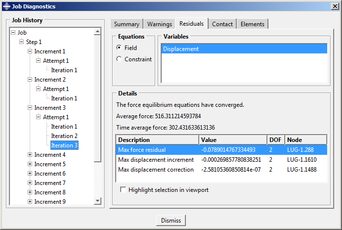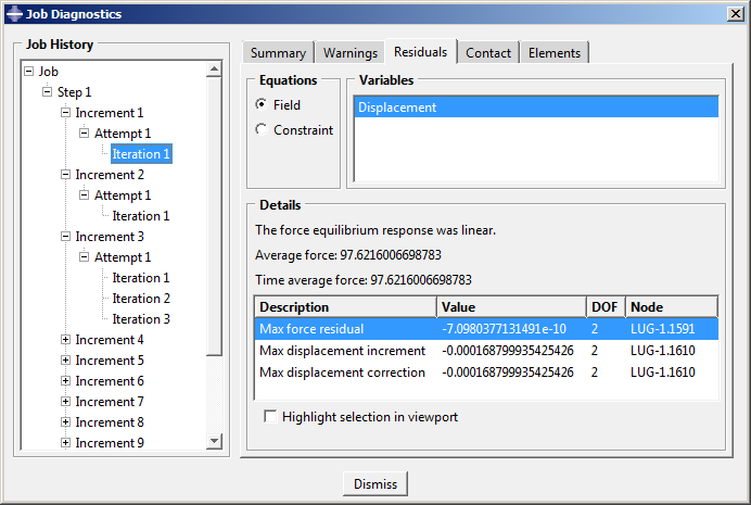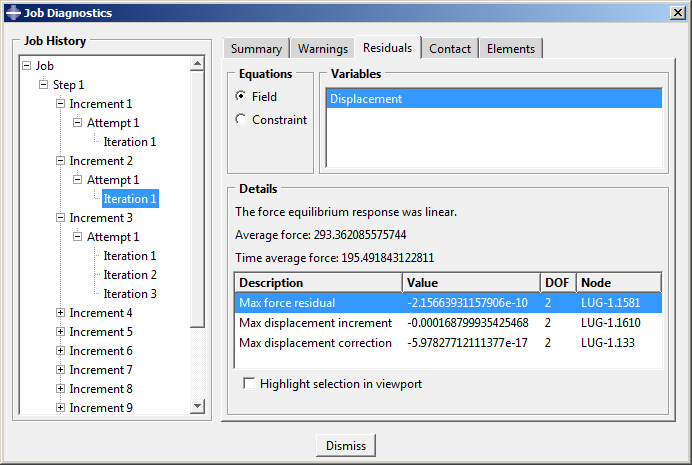 Visualization 모듈을 시작하고 Plastic_Lug_No_Hard.odb 파일을 연다. Job Diagnostics 대화 상자를 열고, 작업 수렴 기록을 확인한다. 다음 그림에서 이 해석의 첫 번째 증분에 대한 정보를 보면 모델의 초기 거동이 선형으로 판단된다는 것을 알 수 있다. 이 판정은 잔류하는 힘의 크기($ r_{max}^{\alpha}$)가 10-8$ q^{-\alpha} $(시간 평균 힘)보다 작은 것에 따른다.