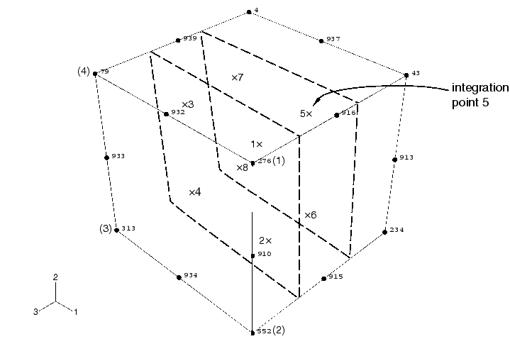 4. 구성 절점 목록을 원형 형상 표시와 비교하여 자신의 C3D20R 요소의 어느 면이 ‘3차원 Solid 요소 라이브러리’에 정의되었다. 3-4면인지 확인한다. 예를 들어, 그림 10.23에서 276-552-313-79면은 1-2-3-4면에 해당한다. 따라서 적분점은 이 그림에 표시된 대로 번호가 매겨진다. 여기서 적분점 5에 해당하는 포인트가 대상이다.