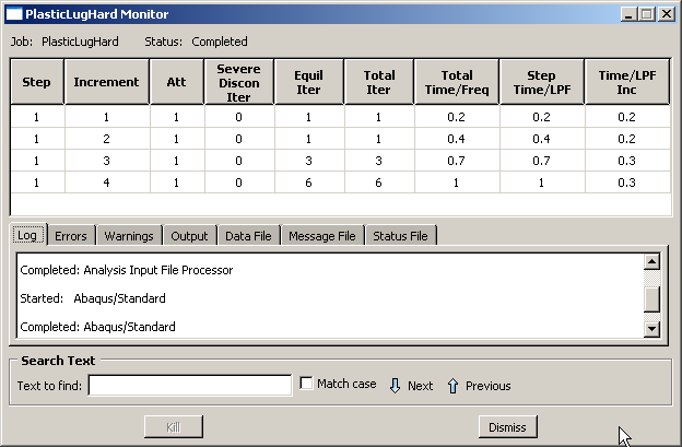 Abaqus/Standard가 해석을 종료하면 Job Monitor는 다음 그림과 같은 정보를 표시한다.