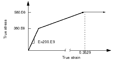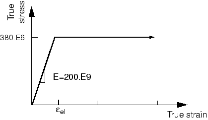 강철에 사용할 수 있는 비탄성 재료 데이터는 항복 응력(380MPa)과 파괴 시의 변형(0.15)뿐이다. 다음 그림과 같이 이 강철은 완전 소성(perfectly plastic)이라고 가정한다. 재료는 경화되지 않고, 응력은 380MPa를 초과하지 않는다.