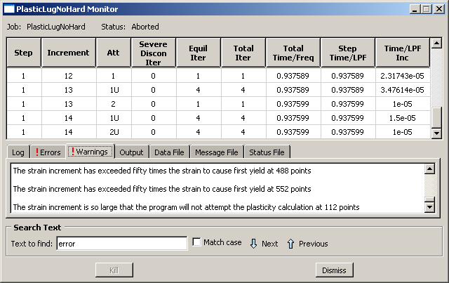 이 문제를 진단하려면 Job Monitor 대화 상자에서 Warnings 탭을 클릭한다. 이 탭에서 다음 그림과 같이 대변형률 증가와 소성 계산 문제에 대한 많은 경고 메시지가 있다. 소성 계산 문제는 보통 변형 증분이 지나치게 큰 결과이므로 이런 경고는 서로 관련되어 있다. 가끔 이런 문제는 발산을 일으킨다. 따라서 소성 계산의 수치 문제로 Abaqus/Standard가 해석을 조기에 중단했을 수 있다.