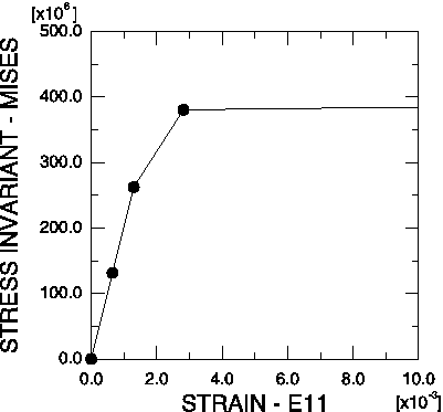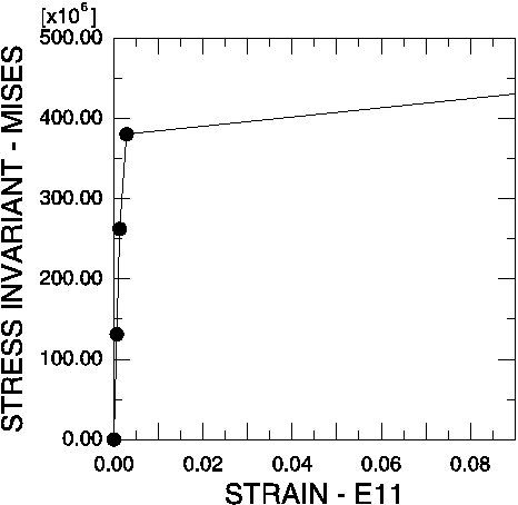 소성 모델은 Mises 응력으로 소성 항복을 정의하므로 진 응력 텐서의 성분이 아닌 Mises 응력을 사용한다. 이 시점에서 E11 변형률 성분은 전체 변형률 텐서의 최대 성분이므로 이 변형률 성분을 사용한다. 이 변형률 성분을 사용하면 이 적분점에서 재료의 탄성 거동과 소성 거동을 명확하게 보여준다.