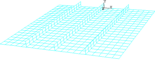 변형 형상으로부터 중앙 보강재가 거의 순수한 면내 휨을 받는다는 것을 알 수 있다. 보강재의 깊이 방향으로 1차 저감 적분 요소를 2개만 사용하므로, 면내 휨 거동의 모델링은 불충분하다. 이 거친 요소망은 Hourglass 모드가 거의 없으므로 적절한 해를 얻는 것처럼 보인다. 하지만 완성하려면 보강재의 요소망을 미세하게 만들 때 해의 변화를 조사한다. 요소망을 세분화하면 요소 수가 증가하고, 요소 크기가 줄어들어 계산 시간이 증가하므로 요소망을 세분화할 때 주의가 필요하다.