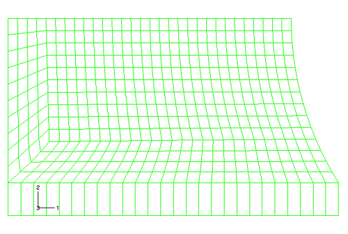 고무 마운트의 모서리에 있는 요소의 왜곡은 바람직하지 않다. 이 부분의 결과는 신뢰할 수 없다. 또한 하중이 증가하면 이 해석이 실패할 수 있다. 이런 문제는 요소망 분할을 개선하여 수정할 수 있다. 그림 10.67에 표시된 요소망은 고무 모델의 왼쪽 아래 모서리에 있는 요소의 왜곡을 줄이는 데 사용할 수 있는 요소망 분할의 예이다. 반대쪽 모서리의 요소망 왜곡과 관련된 문제는 ‘체적 잠금을 줄이는 기술’에서 다룬다. 이 왼쪽 아래 모서리 영역의 요소는 초기 원형 모양에서 이전보다 훨씬 뒤틀린다. 그러나 해석이 진행되고 요소가 변형되면 이 모양이 실질적으로 개선된다. 그림 10.68에 표시된 변형 표시는 이 영역의 요소 왜곡 크기가 감소했다는 것을 보여주지만, 고무 모델의 오른쪽 아래 모서리에 있는 요소망의 왜곡 수준은 여전히 높다.