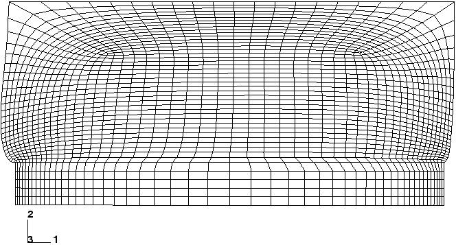 이 모델에 대응하는 변형은 다음 그림과 같다. 이 그림에서 고무 모델의 중요한 영역에서 요소망 왜곡이 크게 줄어든 것이 분명하다. 압력의 등고선(요소간 평균화 없음)을 조사하면 요소 사이에 압력 응력이 매끄럽게 변화하고 있다는 것을 알 수 있다. 따라서 체적 잠금이 제거되었다는 것을 알 수 있다.