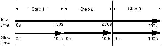 Abaqus는 해석에서 두 시간의 척도를 가진다. 총시간(total time)은 모든 일반 단계에서 증가하는 각 일반 단계의 전체 단계 시간의 누적값이다. 또한 각 단계는 Step time이라고 하는 고유한 시간이 있다. 이것은 단계마다 ‘0’부터 시작한다. 하중과 경계 조건을 변경하는 시간은 임의 시간으로 지정할 수 있다. 이력이 각 길이가 100초인 3단계로 나눈 해석의 시간 스케일이 다음 그림에 나와 있다.