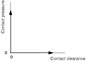 분리된 두 표면 사이의 거리를 Clearance라고 한다. 두 표면 사이의 간격이 ‘0’이 되면 접촉 구속이 적용된다. 접촉을 공식화할 때 표면 사이에 전달할 수 있는 접촉 압력의 크기는 무제한이다. 표면이 분리되면 접촉 압력이 ‘0’ 또는 음수가 되고, 접촉 구속이 제거된다. Hard 접촉이라고 이 거동은 Abaqus의 기본 접촉 거동이며, 다음 그림에 표시된 접촉 압력과 간격의 관계로 설명된다.