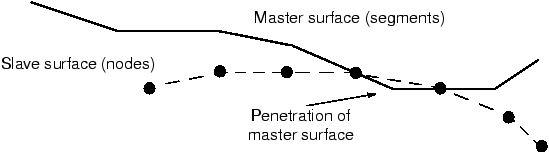 기본적으로 Abaqus/Standard의 접촉 쌍은 순수한 Master/Slave 접촉 알고리즘을 사용한다. 그림 12.7과 같이 한 표면(Slave)의 절점은 다른 표면(Master)을 구성하는 부분을 관통할 수 없다. 이 알고리즘은 Master 평면에 제약을 주지 않는다. 다음 그림과 같이 Master 표면은 Slave 절점 사이를 통과할 수 있다.