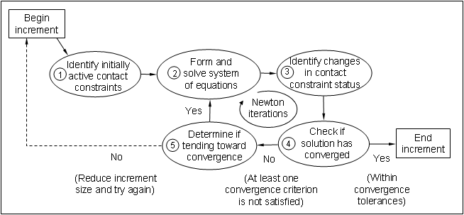 다음 그림에 표시된 Abaqus/Standard 접촉 알고리즘은 뉴턴-랩슨 기법으로 구축되었다. Abaqus/Standard는 각 증분이 시작할 때 모든 접촉 상호 작용의 상태를 조사하여 Slave 절점을 개방 또는 폐쇄로 분류한다. 절점이 닫히면 Abaqus/Standard는 절점이 미끄러지는 상태인지 붙어있는 상태인지를 결정한다. Abaqus/Standard는 각 폐쇄 절점에 구속을 적용하고, 접촉 상태가 폐쇄에서 개방으로 변경되는 모든 절점에서 구속조건을 제거한다. 그다음 Abaqus/Standard는 반복을 수행하고 계산된 보정량을 사용하여 모델 배치를 업데이트한다.