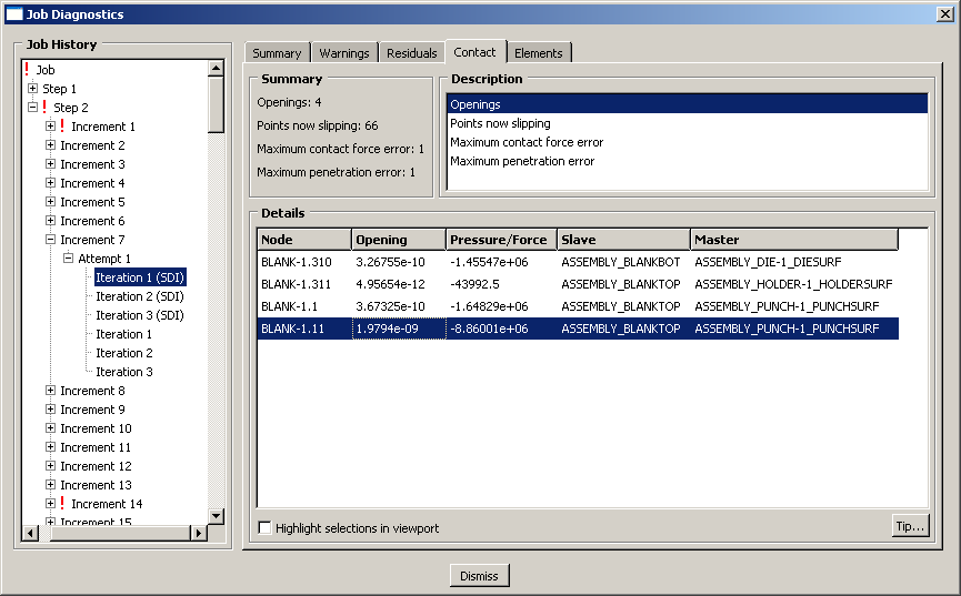 Visualization 모듈을 시작하고 Channel.odb 파일을 열고 접촉 진단 정보를 본다. 2단계의 첫 번째 심각한 불연속 반복은 블랭크의 네 개 절점이 접촉 개방 상태에 있고, 예상 접촉 상태가 부적합하다는 것이다. 다음 그림과 같이 이 불일치는 Job Diagnostics 대화 상자의 Contact 탭에서 볼 수 있다. 이런 절점이 모델의 어느 위치에 있는지 확인하려면 Highlight selections in viewport를 켠다.