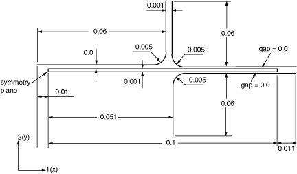 2차원인 평면 변형률 모델을 사용한다. 모델이 면외 방향으로 변형이 발생하지 않는다는 가정은 구조가 면외 방향으로 길 때 효과적이다. 이 성형 공정은 채널의 중심을 따라 평면에 대칭이므로 채널의 절반만 만든다. 이 모델은 일반 접촉 대신 접촉 쌍 알고리즘을 사용한다. 일반 접촉은 Abaqus/Standard의 해석용 강체 서피스를 사용할 수 없기 때문이다. 각 구성 요소의 치수는 다음 그림과 같다.