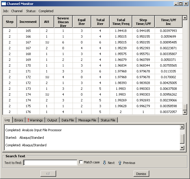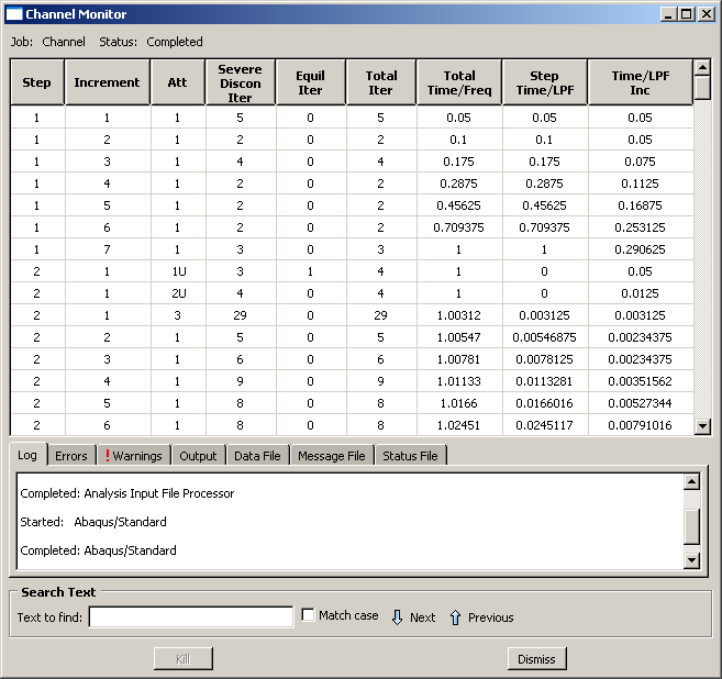 이 해석은 완료하는 데 약 180번의 증분을 사용한다. Job Monitor의 첫 번째 부분은 그림과 같다. 펀치 변위 값은 Output 탭에 표시된다. 이 해석은 많은 심각한 불연속 반복이 수행된다. 2단계의 첫 번째 증분은 접촉 상태를 결정할 때 어려움이 있다. Punch_Surf 서피스와 Blank_Top 서피스의 적절한 배치를 찾고 평형을 맞추기 전에 3번의 시도가 필요하다. 이 시작의 어려운 부분을 지나면 증분의 크기가 더 합리적인 값으로 빠르게 증가한다. Job Monitor의 마지막 부분은 그림과 같다.