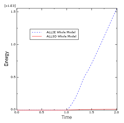 접촉 안정화의 존재로 문제의 물리적 현상이 크게 변하지 않는지 확인하는 것이 중요하다. 이 요구 사항을 평가하는 한 가지 방법은 구조의 내부 에너지(ALLIE)와 분산된 안정화 에너지(ALLSD)를 비교하는 것이다. 이상적으로 안정화 에너지의 양은 내부 에너지에 비해 작아야 한다. 다음 그림은 안정화 에너지와 내부 에너지의 변화를 보여준다. 분산된 안정화 에너지가 실제로 작다는 것을 명확하게 알 수 있다.